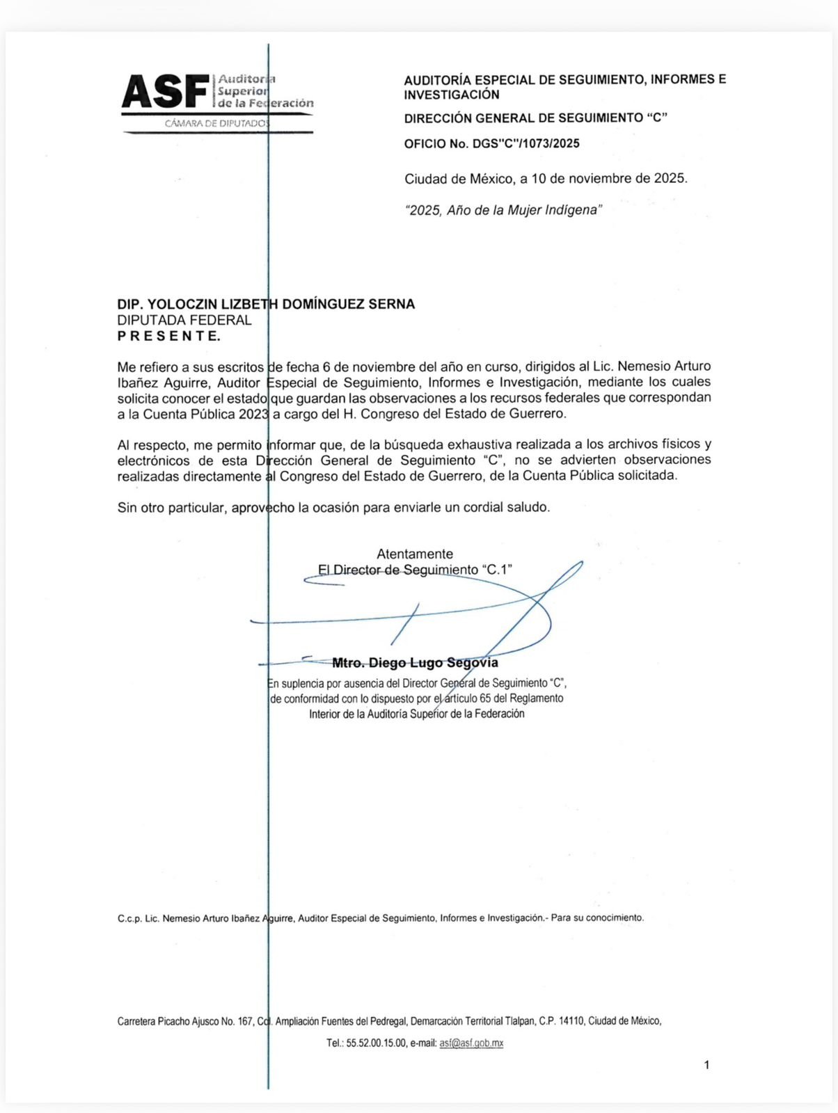 La Auditoría Superior de la Federación (ASF) aclaró que no existen observaciones ni señalamientos pendientes de solventar respecto a la Cuenta Pública 2023 del Congreso del Estado de Guerrero, periodo en el que fungió como presidenta de la Junta de Coordinación Política (JUCOPO) la diputada Yoloczin Domínguez Serna.