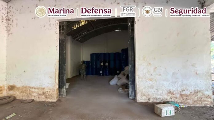 En el marco de las acciones permanentes para el mantenimiento del Estado de derecho, elementos de la Secretaría de Marina (Semar), a través de la Armada de México, en coordinación con la Secretaría de Seguridad y Protección Ciudadana (SSPC), Fiscalía General de la República (FGR), Secretaría de la Defensa Nacional (Defensa) y Guardia Nacional (GN), en dos acciones diferentes, localizaron e inhabilitaron una bodega con precursores químicos y un campamento empleados para la producción de drogas sintéticas, en un poblado del municipio de Petatlán, en el estado de Guerrero.