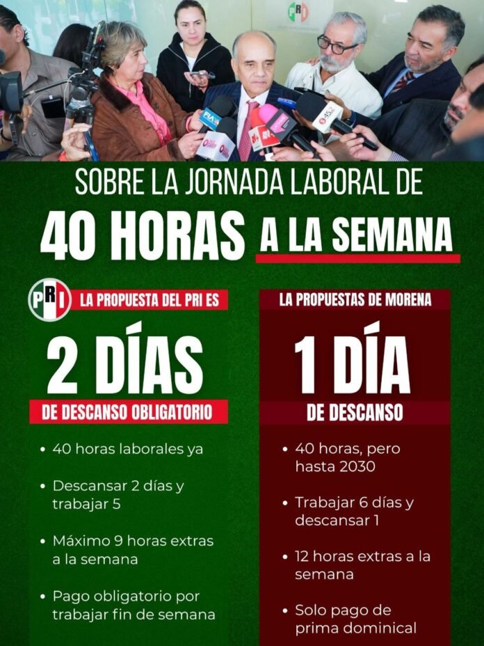 La propuesta del PRI, que Morena desechó, incluía dos días de descanso a la semana, es decir, 40 horas laborales a partir de este año, así como el pago obligatorio que incluye los fines de semana.